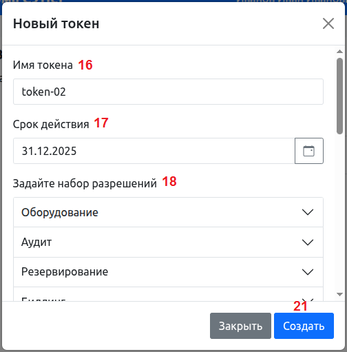 Для создания токена необходимо нажать «Создать» (15). Откроется форма «Новый токен».