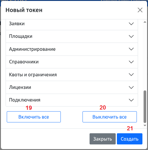 Кнопка «Включить все» (19) позволяет назначить все, предоставленные для выбора разрешения, после авторизации по токену.