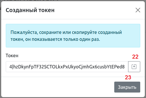 Для завершения создания токена необходимо нажать кнопку «Создать» (21). В окне «Созданный токен» отобразится предупреждение о том, что токен показывается только один раз. Его необходимо скопировать и сохранить. Для копирования в буфер обмена используется кнопка «Скопировать в буфер обмена» (22).