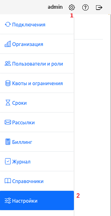Раздел «Настройки» (2) доступен в меню «Администрирование» (1).