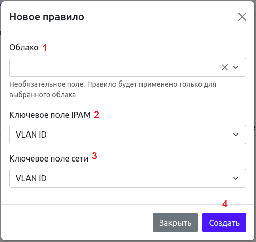 Возможно отфильтровать по ключевому слову доступные сети в IPAM (2) и доступные сети в подключенных системах виртуализации (3). Дополнительно можно отфильтровать системы виртуализации (4).