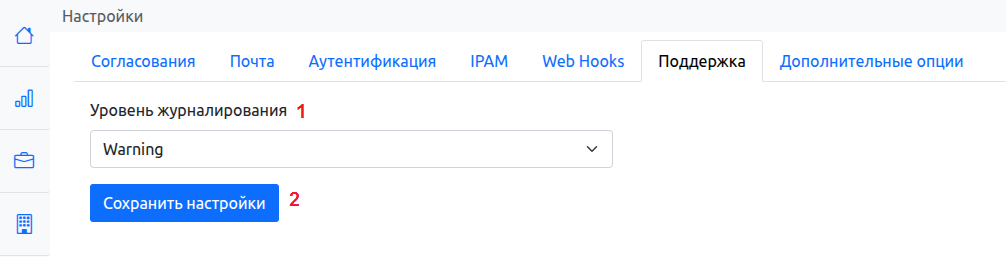 Подраздел «Поддержка» расположен в одноименной вкладке раздела «Настройки» меню «Администрирование».