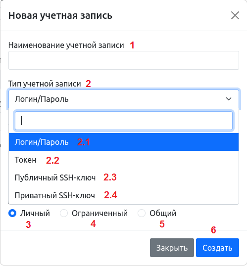 Создание УЗ может осуществляться при наличии соответствующих прав в справочнике «Учетные записи» или в форме «Новая учетная запись», доступной при нажатии кнопки «Добавить учетные данные» (9).