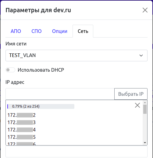 При наличии внешнего провайдера IPAM, подключенного к платформе, необходимо нажать «Выбрать IP» (9) для получения списка доступных IP-адресов выбранной сети.
