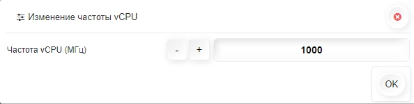 При нажатии кнопки Изменение частоты vCPU в открывшемся окне необходимо указать частоту в МГц, после чего подтвердить операцию, нажав кнопку ОК.