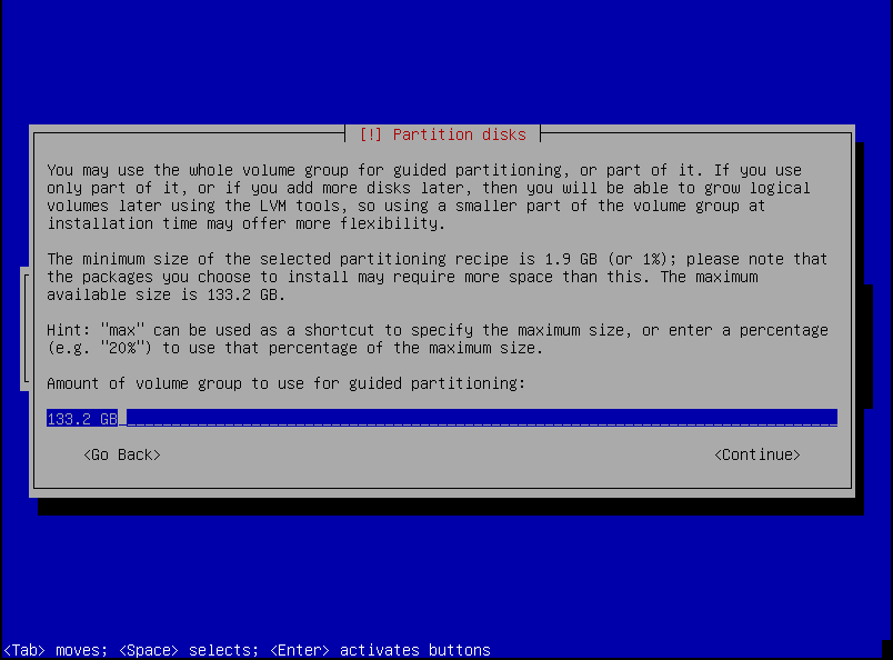 Инсталлятор предложит выбрать размер, доступный для группы томов LVM.