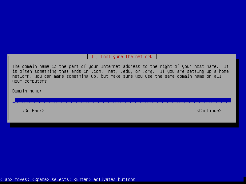 Задать имя домена в меню конфигурации сети и нажать <Continue>.