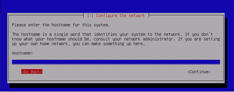 Дождаться окна для ввода названия хоста (Hostname) и нажать <Go Back>.