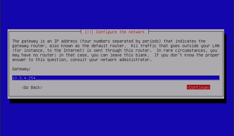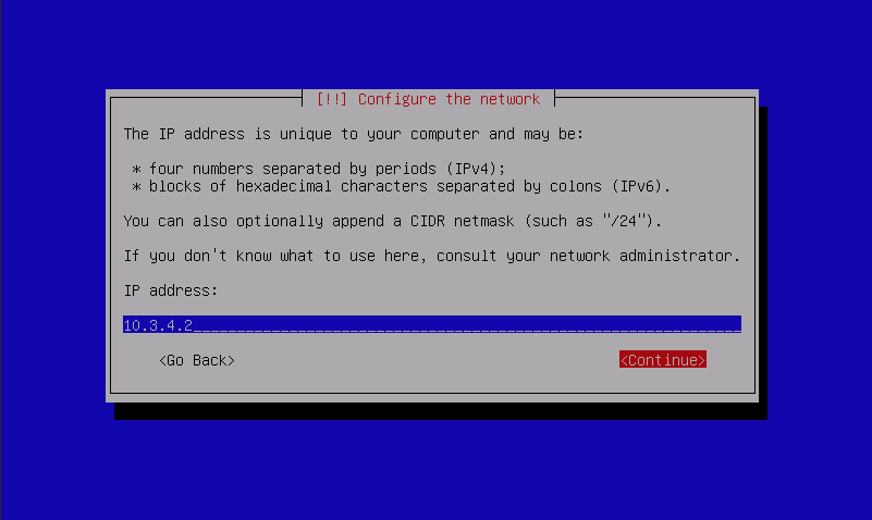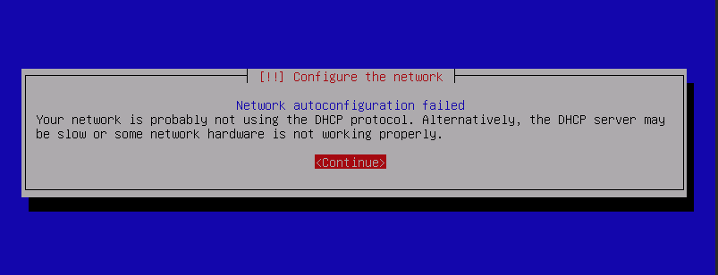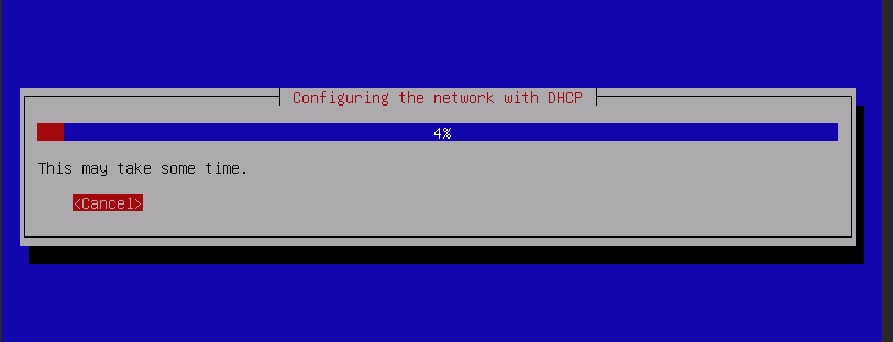 Во время автоматической установки сети с DHCP-сервером (этап Configuring the network with DHCP) прервать процесс, нажав Cancel.