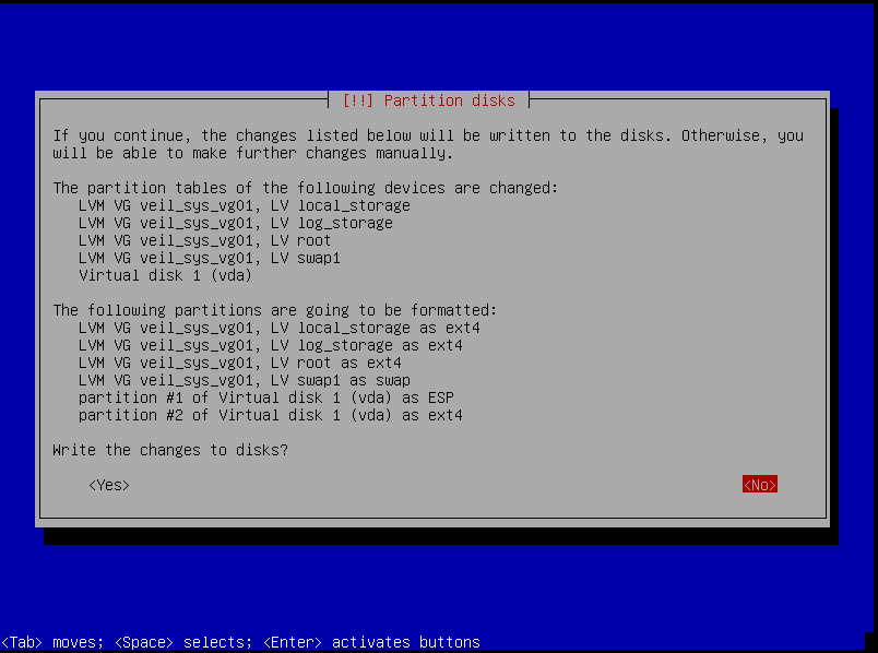 Далее необходимо подтвердить выбранную конфигурацию в меню разбивки диска, выбрав Yes и нажав Enter.