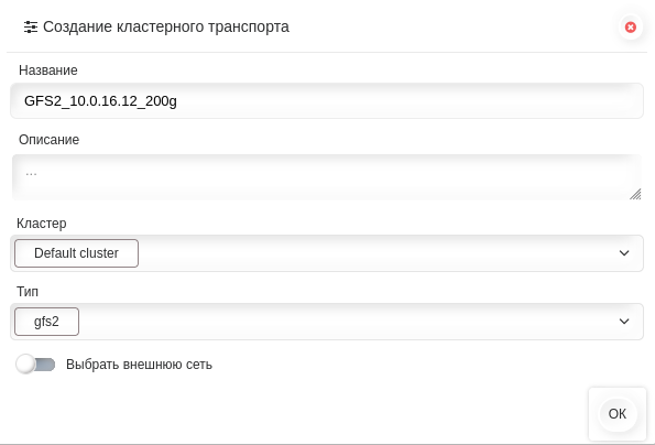 В случае, если для кластерного транспорта настроена внешняя сеть, необходимо активировать опцию Выбрать внешнюю сеть и указать ее.