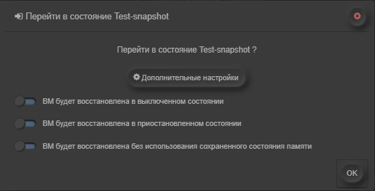 Для выполнения перехода ВМ к состоянию снимка необходимо открыть окно подробного просмотра снимка и нажать кнопку Перейти в состояние.