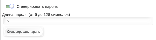В окне профиля любой пользователь может изменить свой пароль, нажав кнопку Изменить пароль. В открывшемся окне необходимо указать текущий и новый пароль, также есть возможность сгенерировать новый пароль.