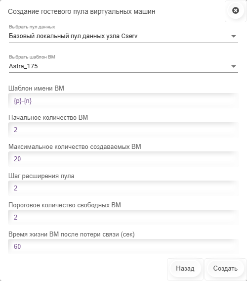 Создание гостевого пула производится с помощью кнопки Создать пул в разделе Виртуальные пулы панели администратора.